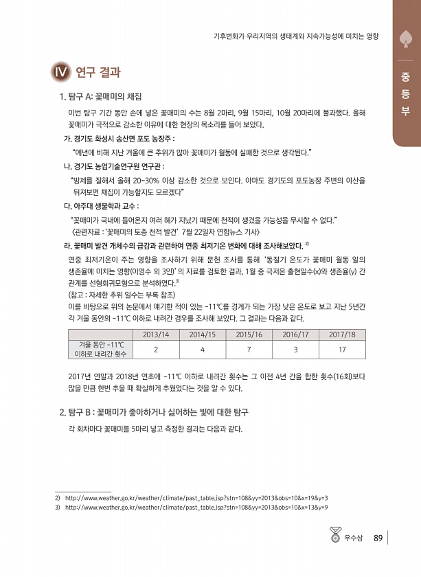우수상 89 중 등 부 기후변화가 우리지역의 생태계와 지속가능성에 미치는 영향 IV 연구 결과 1. 탐구 A꽃매미의 채집 이번 탐구 기간 동안 손에 넣은 꽃매미의 수는 8월 2마리, 9월 15마리, 10월 20마리에 불과했다. 올해 꽃매미가 극적으로 감소한 이유에 대한 현장의 목소리를 들어 보았다. 가. 경기도 화성시 송산면 포도 농장주 “예년에 비해 지난 겨울에 큰 추위가 많아 꽃매미가 월동에 실패한 것으로 생각된다.” 나. 경기도 농업기술연구원 연구관 “방제를 잘해서 올해 2030% 이상 감소한 것으로 보인다. 아마도 경기도의 포도농장 주변의 야산을 뒤져보면 채집이 가능할지도 모르겠다” 다. 아주대 생물학과 교수 “꽃매미가 국내에 들어온지 여러 해가 지났기 때문에 천적이 생겼을 가능성을 무시할 수 없다....