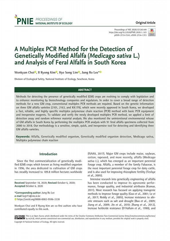 A Multiplex PCR Method for the Detection of Genetically Modified Alfalfa Medicago sativa L. and Analysis of Feral Alfalfa in South Korea Wonkyun Choi , Il Ryong Kim , Hye Song Lim , Jung Ro Lee* Division of Ecological Safety, National Institute of Ecology, Seocheon, Korea This is an Open Access article distributed under the terms of the Creative Commons Attribution Non-Commercial License http//cre...
