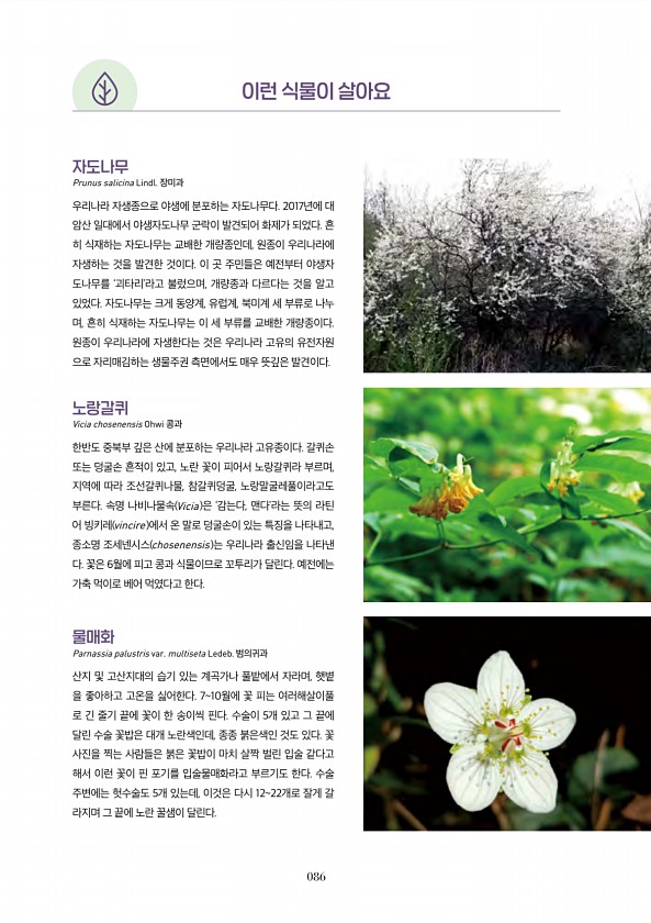 086 물매화 Parnassia palustris var. multiseta Ledeb. 범의귀과 산지 및 고산지대의 습기 있는 계곡가나 풀밭에서 자라며, 햇볕 을 좋아하고 고온을 싫어한다. 710월에 꽃 피는 여러해살이풀 로 긴 줄기 끝에 꽃이 한 송이씩 핀다. 수술이 5개 있고 그 끝에 달린 수술 꽃밥은 대개 노란색인데, 종종 붉은색인 것도 있다. 꽃 사진을 찍는 사람들은 붉은 꽃밥이 마치 살짝 벌린 입술 같다고 해서 이런 꽃이 핀 포기를 입술물매화라고 부르기도 한다. 수술 주변에는 헛수술도 5개 있는데, 이것은 다시 1222개로 잘게 갈 라지며 그 끝에 노란 꿀샘이 달린다. 노랑갈퀴 Vicia chosenensis Ohwi 콩과 한반도 중북부 깊은 산에 분포하는 우리나라 고유종이다. 갈퀴손 또는 덩굴손...