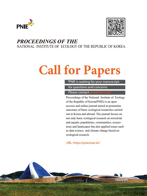 Proceedings of the National Institute of Ecology of the Republic of Korea PNIE is an open accesss and online journal aimed at promotion outcomes of basic ecological researches carried out in Korea and abroad. The journal focuse on not only basic ecological research on terrestrial and aquatic populations, communities, ecosystems and landscapes but also applied issues such as data science and climat...