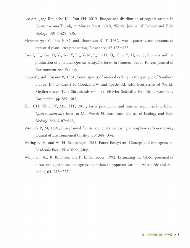 2장 육상생태계와 기후변화 89 Lee SH, Jang RH, Cho KT, You YH. 2015. Budget and distribution of organic carbon in Quercus serrata Tunb. ex Murray forest in Mt. Worak. Journal of Ecology and Field Biology. 38 4 425-436. Meentemeyer V., Box E. O. and Tompson R. T. 1982. World patterns and amounts of terrestrial plant litter production. Bioscience. 32125-128. Park I. H., Kim D. Y., Son Y. H., Yi M. J., Jin H. O....