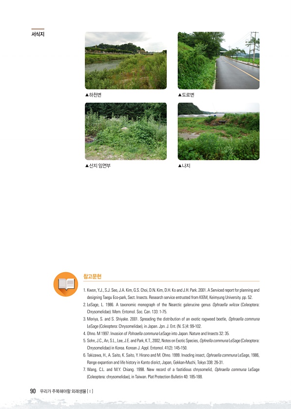 90 우리가 주목해야할 외래생물 [Ⅰ] 서식지 참고문헌 1. Kwon, Y.J., S.J. Seo, J.A. Kim, G.S. Choi, D.N. Kim, D.H. Ko and J.H. Park. 2001. A Serviced report for planning and designing Taegu Eco-park, Sect. Insects. Research service entrusted from KIEM, Keimyung University. pp. 52. 2. LeSage, L. 1986. A taxonomic monograph of the Nearctic galerucine genus Ophraella wilcox ColeopteraChrysomelidae Mem. Entomol. Soc. Can. 1...