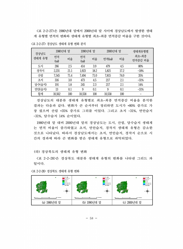 58 표 2-2-27 은 1980년대 말에서 2000년대 말 사이에 경상남도에서 발생한 생태 계 유형별 면적의 변화와 생태계 유형별 최초-최종 면적증감 비율을 구한 것이다. 경상남도 생태계 유형 1980년대 말 1990년대 말 2000년대 말 생태계유형별 최초-최종 면적증감 비율 면적 ㎢ 비율 면적 ㎢ 비율 면적 ㎢ 비율 도시 266 2.5 414 3.9 479 4.5 80% 경작지 2,231 21.1 1,923 18.2 1,821 17.2 -18% 산림 7,545 71.4 7,494 71.0 7,815 74.0 35% 초지 316 3.0 473 4.5 217 2.1 -31% 담수 습지 191 1.8 245 2.3 217 2.1 14% 연안 습지 13 0.1 9 0.1 9 0.1 -31% 합계 10,562 ...