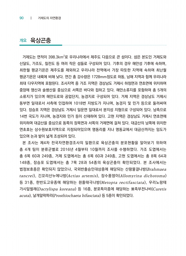90 ┃ 거제도의 자연환경 개요 육상곤충 거제도는 면적이 398.3km2로 우리나라에서 제주도 다음으로 큰 섬이다. 섬은 본도인 거제도와 신달도, 가조도, 칠전도 등 여러 작은 섬들로 구성되어 있다. 기후의 경우 해안성 기후에 속하며, 최한월 평균기온은 제주도를 제외하고 우리나라 전역에서 가장 따듯한 지역에 속하며 최난월 평균기온은 내륙에 비해 낮다. 연간 총 강수량은 1728mm정도로 하동, 남해 지역과 함께 우리나라 최대 다우지역에 포함된다. 조사지역 중 가조 지역은 경상남도 거제시 하청면과 연초면에 위치하며 중앙에 앵산과 솔병산을 중심으로 서쪽은 바다와 접하고 있다. 해안소류지를 포함하여 총 5개의 소류지가 있으며 해안도로와 공업단지, 농경지로 구성되어 있다. 거제 지역은 경상남도 거제시 동부면 일대로...