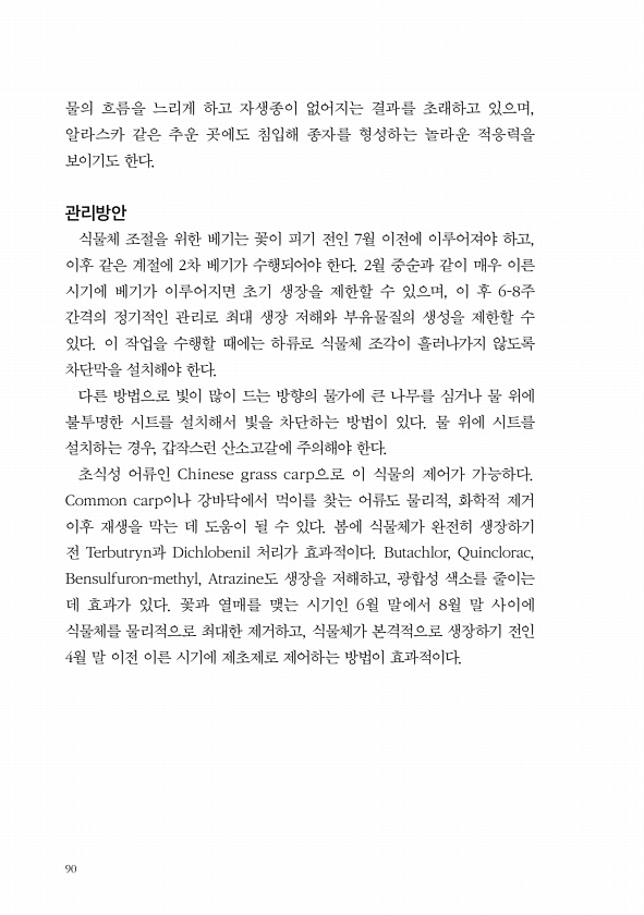 90 물의 흐름을 느리게 하고 자생종이 없어지는 결과를 초래하고 있으며, 알라스카 같은 추운 곳에도 침입해 종자를 형성하는 놀라운 적응력을 보이기도 한다. 관리방안 식물체 조절을 위한 베기는 꽃이 피기 전인 7월 이전에 이루어져야 하고, 이후 같은 계절에 2차 베기가 수행되어야 한다. 2월 중순과 같이 매우 이른 시기에 베기가 이루어지면 초기 생장을 제한할 수 있으며, 이 후 6-8주 간격의 정기적인 관리로 최대 생장 저해와 부유물질의 생성을 제한할 수 있다. 이 작업을 수행할 때에는 하류로 식물체 조각이 흘러나가지 않도록 차단막을 설치해야 한다. 다른 방법으로 빛이 많이 드는 방향의 물가에 큰 나무를 심거나 물 위에 불투명한 시트를 설치해서 빛을 차단하는 방법이 있다. 물 위에 시트를 설치하는 경우, 갑작...