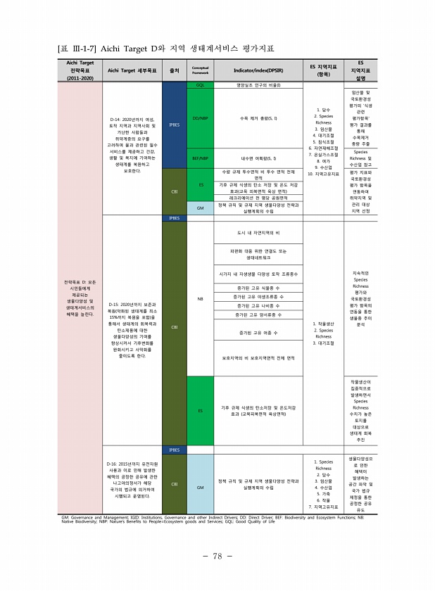 78 Aichi Target 전략목표 2011-2020 Aichi Target 세부목표 출처 Conceptual Framework Indicator/index DPSIR ES 지역지표 항목 ES 지역지표 설명 전략목표 D모든 시민들에게 제공되는 생물다양성 및 생태계서비스의 혜택을 늘린다. D-142020년까지 여성, 토착 지역과 지역사회 및 가난한 사람들과 취약계층의 요구를 고려하여 물과 관련된 필수 서비스를 제공하고 건강, 생활 및 복지에 기여하는 생태계를 복원하고 보호한다. IPBES GQL 영양실조 인구의 비율 I 1. 담수 2. Species Richness 3. 임산물 4. 대기조절 5. 침식조절 6. 자연재해조절 7. 온실가스조절 8. 여가 9. 수산업 10. 지역고유지표 DD/NBP 수목 제거 ...