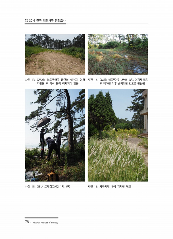 2016 전국 해안사구 정밀조사 78 ? National Institute of Ecology 사진 13. GM2의 블로우아웃 끝단의 훼손지농경 지활용 후 폐석 등이 적재되어 있음 사진 14. GM2의 블로우아웃 내부의 습지농경지 활용 후 버려진 이후 습지화한 것으로 판단됨 사진 15. OSL시료채취 GM2 1차사구 사진 16. 사구지대 내에 위치한폐교
