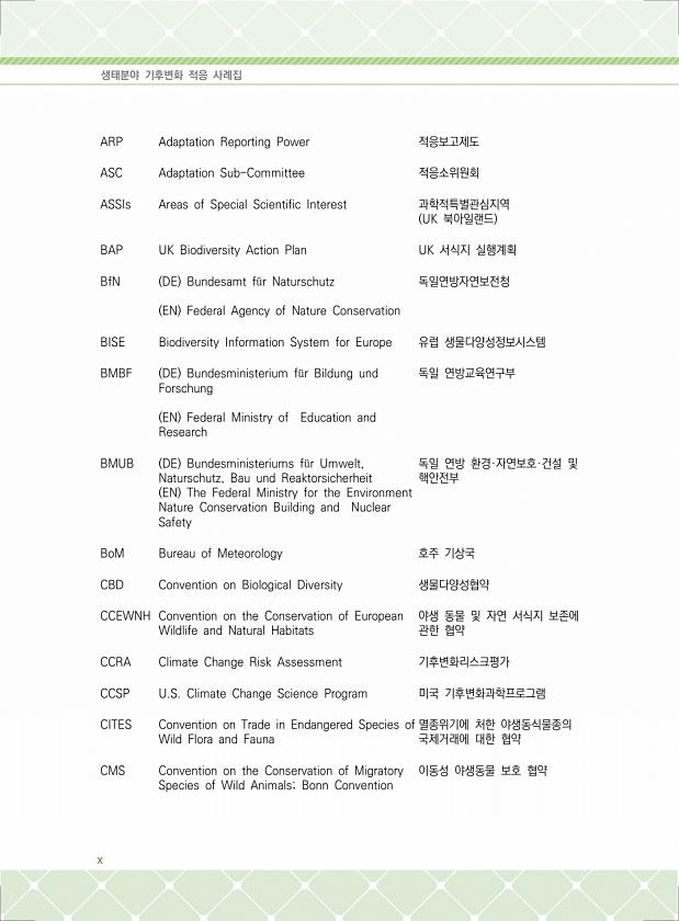 생태분야 기후변화 적응 사례집 x ARP Adaptation Reporting Power 적응보고제도 ASC Adaptation Sub-Committee 적응소위원회 ASSIs Areas of Special Scientific Interest 과학적특별관심지역 UK 북아일랜드 BAP UK Biodiversity Action Plan UK 서식지 실행계획 BfN DE Bundesamt f?r Naturschutz EN Federal Agency of Nature Conservation 독일연방자연보전청 BISE Biodiversity Information System for Europe 유럽 생물다양성정보시스템 BMBF DE Bundesministerium f?r Bildung und Forschung EN ...