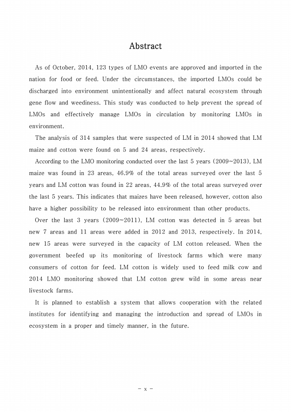 x Abstract As of October, 2014, 123 types of LMO events are approved and imported in the nation for food or feed. Under the circumstances, the imported LMOs could be discharged into environment unintentionally and affect natural ecosystem through gene flow and weediness. This study was conducted to help prevent the spread of LMOs and effectively manage LMOs in circulation by monitoring LMOs in env...