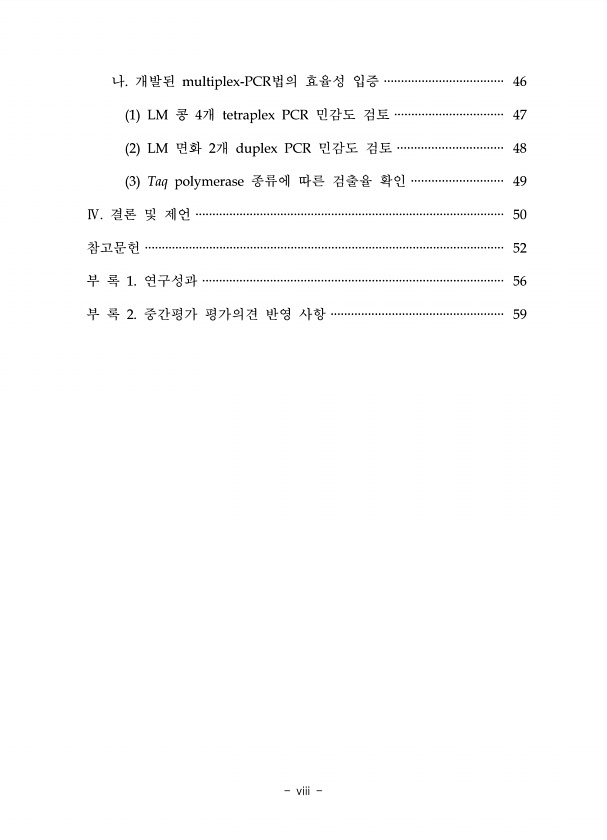나. 개발된 multiplex-PCR법의 효율성 입증 ··································· 46 1 LM 콩 4개 tetraplex PCR 민감도 검토 ································ 47 2 LM 면화 2개 duplex PCR 민감도 검토 ······························· 48 3 Taq polymerase 종류에 따른 검출율 확인 ··························· 49 Ⅳ. 결론 및 제언 ··························································································· 50 참고문헌 ···························...
