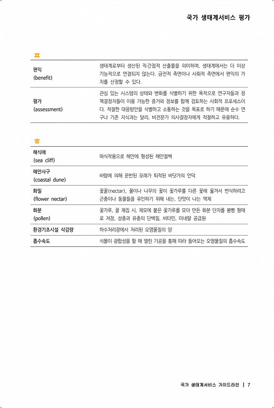 국가 생태계서비스 평가 국가 생태계서비스 가이드라인 ┃ 7 ㅍ 편익 benefit 생태계로부터 생산된 직?간접적 산출물을 의미하며, 생태계에서는 더 이상 기능적으로 연결되지 않는다. 금전적 측면이나 사회적 측면에서 편익의 가 치를 산정할 수 있다. 평가 assessment 관심 있는 시스템의 상태와 변화를 식별하기 위한 목적으로 연구자들과 정 책결정자들이 이용 가능한 증거와 정보를 함께 검토하는 사회적 프로세스이 다. 적절한 대응방안을 식별하고 소통하는 것을 목표로 하기 때문에 순수 연 구나 기존 지식과는 달리, 비전문가 의사결정자에게 적절하고 유용하다. ㅎ 해식애 sea cliff 파식작용으로 해안에 형성된 해안절벽 해안사구 coastal dune 바람에 의해 운반된 모래가 퇴적된 바닷가의 언덕 화밀 fl...