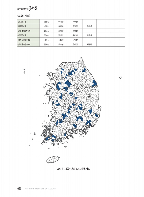 진도 08-31 첨찰산 여귀산 지력산 김해 09-01 신어산 황새봉 작약산 무척산 김해 · 창원 09-02 불모산 보배산 정병산 삼척 10-01 응봉산 백병산 두리봉 사금산 경산 · 영천 10-19 사룡산 구룡산 금박산 경주 · 울산 10-21 금오산 국수봉 천마산 치술령 그림 11. 2004년의 조사지역 지도 표 36 계속 090 NATIONAL INSTITUTE OF ECOLOGY자연환경조사30년