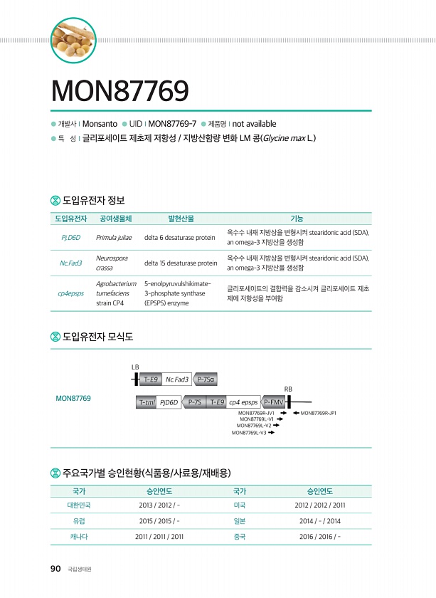 90 국립생태원 ● 개발사ⅠMonsanto ● UIDⅠMON87769-7 ● 제품명Ⅰnot available ● 특 성Ⅰ글리포세이트 제초제 저항성 지방산함량 변화 LM 콩 Glycine max L. MON87769 주요국가별 승인현황 식품용/사료용/재배용 국가 승인연도 국가 승인연도 대한민국 2013 2012 미국 2012 2012 2011 유럽 2015 2015 일본 2014 2014 캐나다 2011 2011 2011 중국 2016 2016 도입유전자 정보 도입유전자 공여생물체 발현산물 기능 Pj.D6D Primula juliae delta 6 desaturase protein 옥수수 내재 지방상을 변형시켜 stearidonic acid SDA , an omega-3 지방산을 생성함 Nc.Fad3 Neur...