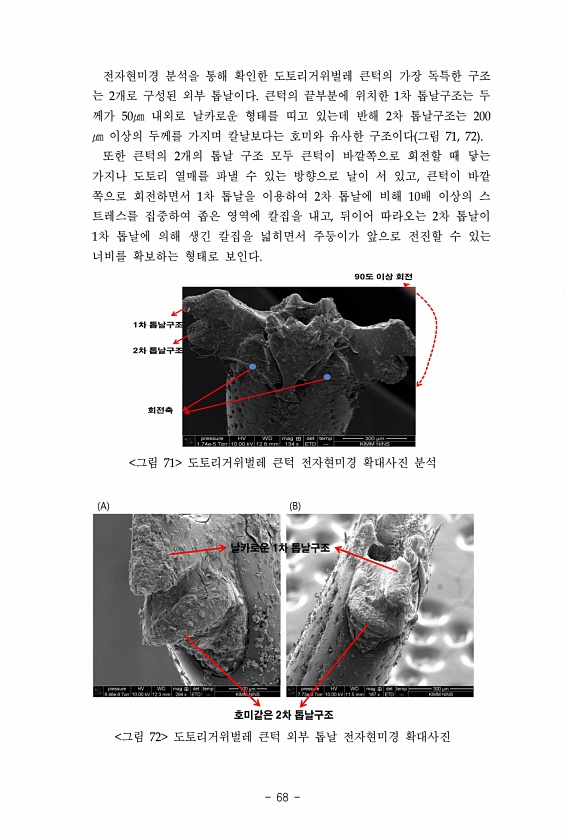 68 전자현미경 분석을 통해 확인한 도토리거위벌레 큰턱의 가장 독특한 구조 는 2개로 구성된 외부 톱날이다. 큰턱의 끝부분에 위치한 1차 톱날구조는 두 께가 50㎛ 내외로 날카로운 형태를 띠고 있는데 반해 2차 톱날구조는 200 ㎛ 이상의 두께를 가지며 칼날보다는 호미와 유사한 구조이다 그림 71, 72 또한 큰턱의 2개의 톱날 구조 모두 큰턱이 바깥쪽으로 회전할 때 닿는 가지나 도토리 열매를 파낼 수 있는 방향으로 날이 서 있고, 큰턱이 바깥 쪽으로 회전하면서 1차 톱날을 이용하여 2차 톱날에 비해 10배 이상의 스 트레스를 집중하여 좁은 영역에 칼집을 내고, 뒤이어 따라오는 2차 톱날이 1차 톱날에 의해 생긴 칼집을 넓히면서 주둥이가 앞으로 전진할 수 있는 너비를 확보하는 형태로 보인다. 그림 71 도토...