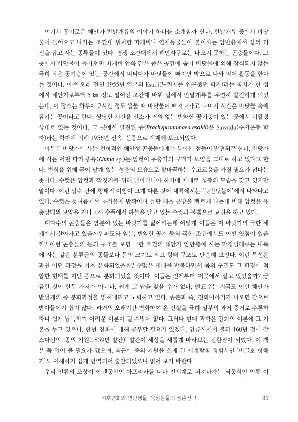 기후변화와 연안생물, 육상동물의 생존전략 89 여기서 흥미로운 해안가 반날개류의 이야기 하나를 소개할까 한다. 반날개류 중에서 바닷 물이 들어오고 나가는 조간대 위치한 따개비나 연체동물들이 붙어사는 암반층에서 삶의 터 전을 잡고 사는 종류들이 있다. 평생 조간대에서 해안사구로는 나오지 못하는 곤충들이다. 그 곳에서 바닷물이 들어오면 따개비 안쪽 같은 좁은 공간에 숨어 바닷물에 의해 잠식되지 않는 극히 작은 공기층이 있는 공간에서 버티다가 바닷물이 빠지면 밖으로 나와 먹이 활동을 한다 는 것이다. 아주 오래 전인 1955년 일본의 Esaki 노린재를 연구했던 학자 라는 학자가 한 섬 에서 해안가로부터 5 ㎞ 정도 떨어진 조간대 바위 밑에서 반날개류를 우연히 발견하게 되었 는데, 이 장소는 하루에 2시간 정도 ...