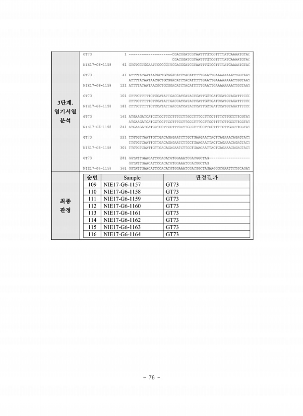 76 3단계. 염기서열 분석 최종 판정 순번 Sample 판정결과 109 NIE17-G6-1157 GT73 110 NIE17-G6-1158 GT73 111 NIE17-G6-1159 GT73 112 NIE17-G6-1160 GT73 113 NIE17-G6-1161 GT73 114 NIE17-G6-1162 GT73 115 NIE17-G6-1163 GT73 116 NIE17-G6-1164GT73