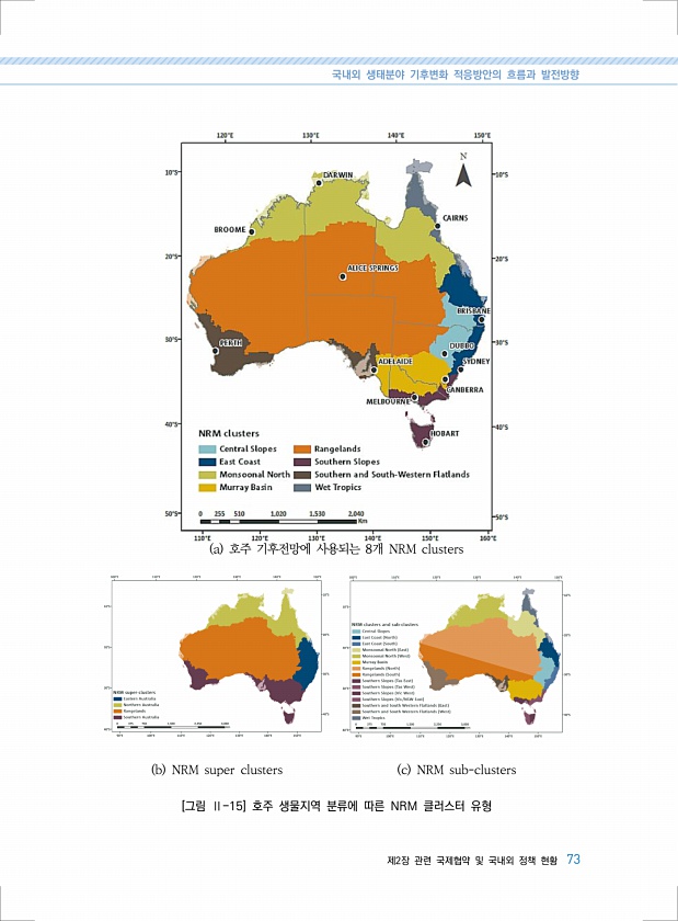 국내외 생태분야 기후변화 적응방안의 흐름과 발전방향 제2장 관련 국제협약 및 국내외 정책 현황 73 a 호주 기후전망에 사용되는 8개 NRM clusters b NRM super clusters c NRM sub-clusters [그림 Ⅱ-15] 호주 생물지역 분류에 따른 NRM 클러스터유형