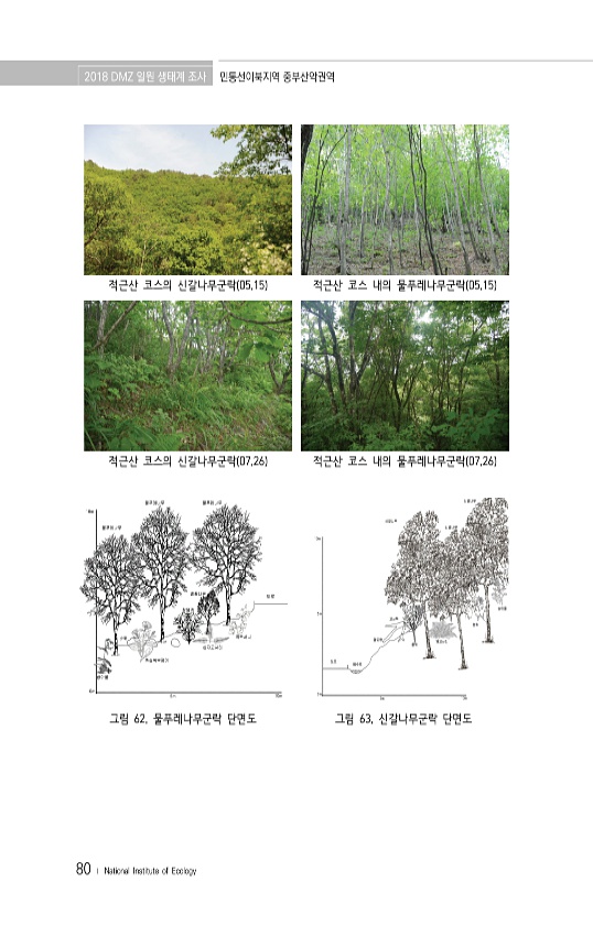 2018 DMZ 일원 생태계 조사 민통선이북지역 중부산악권역 80 ? National Institute of Ecology 적근산 코스의 신갈나무군락 05.15 적근산 코스 내의 물푸레나무군락 05.15 적근산 코스의 신갈나무군락 07.26 적근산 코스 내의 물푸레나무군락 07.26 그림 62. 물푸레나무군락 단면도 그림 63. 신갈나무군락단면도