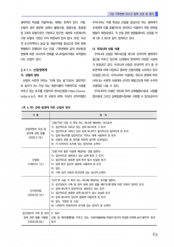 3장 기후변화 리스크 항목 선정 및 평가 69 생태적인 특성을 이끌어내는 데에는 한계가 있다. 가령, 산림의 경우 중분류 상에서 활엽수림, 침엽수림, 혼효림 등 3개의 유형으로만 구분하고 있으면, 세분류 수준에서의 구분 유형과 기준은 아직 마련되어 있지 않다. 또한, 비교 적 도시지역이나 농업 및 개발지역을 중심으로 피복 변화 현행화가 진행되어 오는 만큼, 기후변화와 같이 외부환경 변화에 따른 서식지의 변화를 모니터링하기에도 부적합하 다는 단점이 있다. 3.2.1.1. 산림생태계 가. 산림의 정의 산림의 사전적 의미는 “산에 있는 숲”으로서, 일반적으 로 높이가 3m 이상 되는 목본식물이 지배적으로 식생을 이루고 있는 토지를 산림이라 한다 산림청 https//www. kofpi.or.kr/ 특히 전 국토의 ...