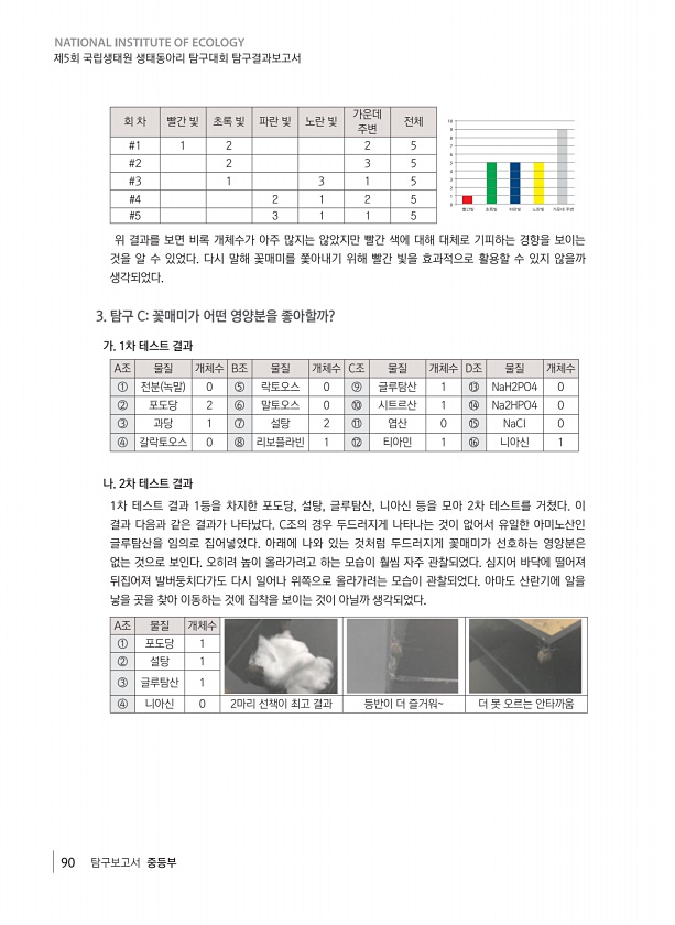90 탐구보고서 중등부 제5회 국립생태원 생태동아리 탐구대회 탐구결과보고서 회 차 빨간 빛 초록 빛 파란 빛 노란 빛 가운데 주변 전체 #1 1 2 2 5 #2 2 3 5 #3 1 3 1 5 #4 2 1 2 5 #5 3 1 1 5 위 결과를 보면 비록 개체수가 아주 많지는 않았지만 빨간 색에 대해 대체로 기피하는 경향을 보이는 것을 알 수 있었다. 다시 말해 꽃매미를 쫓아내기 위해 빨간 빛을 효과적으로 활용할 수 있지 않을까 생각되었다. 3. 탐구 C꽃매미가 어떤 영양분을 좋아할까? 가. 1차 테스트 결과 A조 물질 개체수 B조 물질 개체수 C조 물질 개체수 D조 물질 개체수 ① 전분 녹말 0 ⑤ 락토오스 0 ⑨ 글루탐산 1 ⑬ NaH2PO4 0 ② 포도당 2 ⑥ 말토오스 0 ⑩ 시트르산 1 ⑭ Na2HPO...