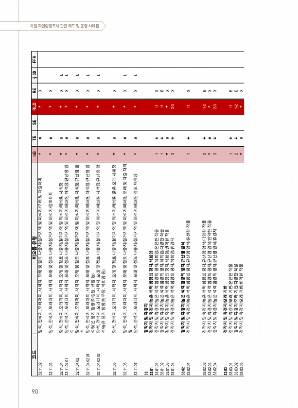 독일 자연환경조사 관련 제도 및 운영 사례집 코드 비오톱 유형 nG TE SE RLD RE § 30 FFH 32.11.02 암석, 전석지, 모래더미, 사력지, 모래 및 점토 나출지/철거지역 및 폐석지/모래 및 자갈더미 ? # ? X 32.11.03 암석, 전석지, 모래더미, 사력지, 모래 및 점토 나출지/철거지역 및 폐석지/점토더미 ? # ? X 32.11.04 암석, 전석지, 모래더미, 사력지, 모래 및 점토 나출지/철거지역 및 폐석지/폐쇄된 채석장 ? # ? X L 32.11.04.01 암석, 전석지, 모래더미, 사력지, 모래 및 점토 나출지/철거지역 및 폐석지/폐쇄된 채석장/탄산염 암 석 ? # ? X L 32.11.04.02 암석, 전석지, 모래더미, 사력지, 모래 및 점토 나출지/철거지역 및 폐석지...