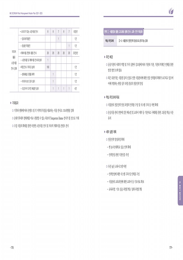 핵심 추진과제 ?-3. 식물관리 전문인력 양성으로 공익기능 강화 전략 ? 식물정보 활용 고도화로 생태 전시·교육·연구 특성화 ▶ 추진 배경 ?? 공공기관의 사회적 역할 및 가치 실현이 강조됨에 따라 기관과 기관, 기관과 학계간 연계를 통한 발전 방안 모색 필요 ?? 최근 유관기관, 식물원 등의 신설로 인한 식물관리에 대한 전문 인력풀의 확대가 요구되고 있으며 이에 부합하는 현장 실무 과정 중심의 전문인력 양성 ▶ 핵심 추진과제 목표 ?? 식물관리 전문인력 양성 과정의 인력풀 구성 및 시스템 구축 등 저변 확대 ?? 온실식물 관리 전반에 걸친 매뉴얼 및 교과서 제작 등 기본자료 구체화를 통한 고품질 학습 수준 유지 ▶ 세부 실행 계획 ?? 전문인력 양성과정 확대 현 농수산대학교 실습 인력 확대 인력양성 관련 ...