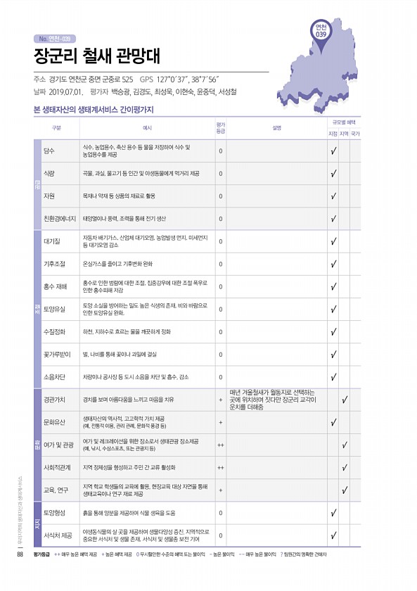 No. 연천- 연천 039 본 생태자산의 생태계서비스 간이평가지 구분 예시 평가 등급 설명 규모별 혜택 지점 지역 국가 공급 담수 식수, 농업용수, 축산 용수 등 물을 저장하여 식수 및 농업용수를 제공 0 √ 식량 곡물, 과실, 물고기 등 인간 및 야생동물에게 먹거리 제공 0 √ 자원 목재나 약재 등 상품의 재료로 활용 0 √ 친환경에너지 태양열이나 풍력, 조력을 통해 전기 생산 0 √ 조절 대기질 자동차 배기가스, 산업체 대기오염, 농업발생 먼지, 미세먼지 등 대기오염 감소 0 √ 기후조절 온실가스를 줄이고 기후변화 완화 0 √ 홍수 재해 홍수로 인한 범람에 대한 조절, 집중강우에 대한 조절 폭우로 인한 홍수피해 저감 0 √ 토양유실 토양 소실을 방어하는 밀도 높은 식생의 존재, 비와 바람으로 인한 토양유...