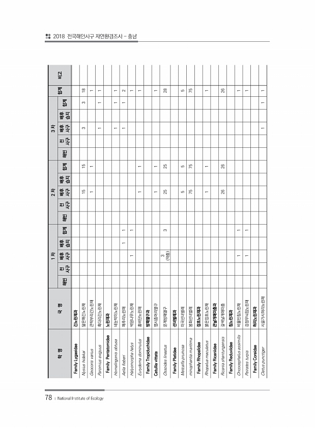 78 학 명 국 명 1 차 2 차 3 차 합계 비고 해빈 전 사구 배후 사구 배후 습지 합계 해빈 사구 전 배후 사구 배후 습지 합계 해빈 사구 전 배후 사구 배후 습지 합계 Family Lygaeidae 긴노린재과 Nysius hidakai 닮은애긴노린재 15 15 3 3 18 Geocoris varius 큰딱부리긴노린재 1 1 1 Paromius exiguus 흑다리긴노린재 1 1 1 Family Pentatomidae 노린재과 Homalingonis obtusa 네눈박이노린재 1 1 1 Aelia fieberi 메추리노린재 1 1 1 1 2 Halyomorpha halys 썩덩나무노린재 1 1 1 Eurydema dominulus 홍비단노린재 1 1 1 Family Tropiduchidae 방패멸구과 ...