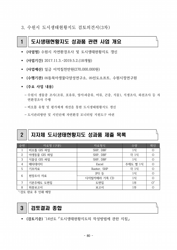 44 식물 88종 검은별고사리 Ⅱ급 구름병아리난초 Ⅱ급 기생꽃 Ⅱ급 생물정보 바로가기 생물정보 바로가기 생물정보바로가기조사 및 도시생태현황지도 갱신 § 사업기간 2017.11.3.-2019.5.2. 18개월 § 사업예산 일금 이억칠천만원 270,000,000원 § 수행기관 ㈜동북아생물다양성연구소, ㈜선도소프트, 수원시정연구원 § 주요 사업 내용 수원시 생물종 조사 조류, 포유류, 양서?파충류, 어류, 곤충, 식물 , 식생조사, 하천조사 등 자 연환경조사 수행 비오톱 유형 및 평가체계 개선을 통한 도시생태현황지도 갱신 도시관리방안 및 시민단체 자연환경 모니터링 지원도구 마련 2 지자체 도시생태현황지도 성과품 제출 목록 3 검토결과 종합 § 검토기준 ‘14년도 「도시생태현황지도의 작성방법에 관한 지침」 순번 자...