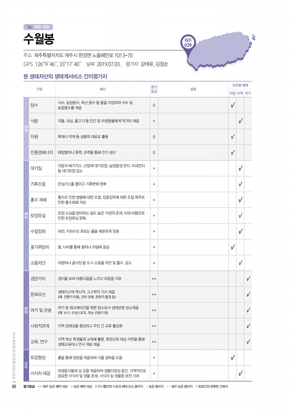 No. 제주- 제주 039 본 생태자산의 생태계서비스 간이평가지 구분 예시 평가 등급 설명 규모별 혜택 지점 지역 국가 공급 담수 식수, 농업용수, 축산 용수 등 물을 저장하여 식수 및 농업용수를 제공 0 √ 식량 곡물, 과실, 물고기 등 인간 및 야생동물에게 먹거리 제공 + √ 자원 목재나 약재 등 상품의 재료로 활용 0 √ 친환경에너지 태양열이나 풍력, 조력을 통해 전기 생산 0 √ 조절 대기질 자동차 배기가스, 산업체 대기오염, 농업발생 먼지, 미세먼지 등 대기오염 감소 + √ 기후조절 온실가스를 줄이고 기후변화 완화 + √ 홍수 재해 홍수로 인한 범람에 대한 조절, 집중강우에 대한 조절 폭우로 인한 홍수피해 저감 + √ 토양유실 토양 소실을 방어하는 밀도 높은 식생의 존재, 비와 바람으로 인한 토양유...