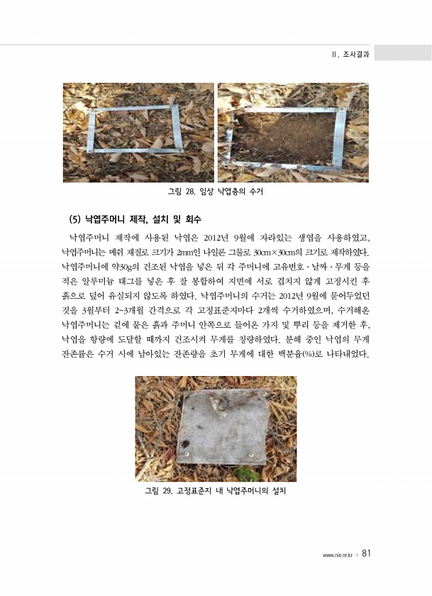Ⅱ. 조사결과 www.nie.re.kr ? 81 그림 28. 임상 낙엽층의 수거 5 낙엽주머니 제작, 설치 및 회수 낙엽주머니 제작에 사용된 낙엽은 2012년 9월에 자라있는 생엽을 사용하였고, 낙엽주머니는 메쉬 재질로 크기가 2mm인 나일론 그물로 30cm×30cm의 크기로 제작하였다. 낙엽주머니에 약30g의 건조된 낙엽을 넣은 뒤 각 주머니에 고유번호·날짜·무게 등을 적은 알루미늄 태그를 넣은 후 잘 봉합하여 지면에 서로 겹치지 않게 고정시킨 후 흙으로 덮어 유실되지 않도록 하였다. 낙엽주머니의 수거는 2012년 9월에 묻어두었던 것을 3월부터 23개월 간격으로 각 고정표준지마다 2개씩 수거하였으며, 수거해온 낙엽주머니는 겉에 뭍은 흙과 주머니 안쪽으로 들어온 가지 및 뿌리 등을 제거한 후, 낙엽을 항량...
