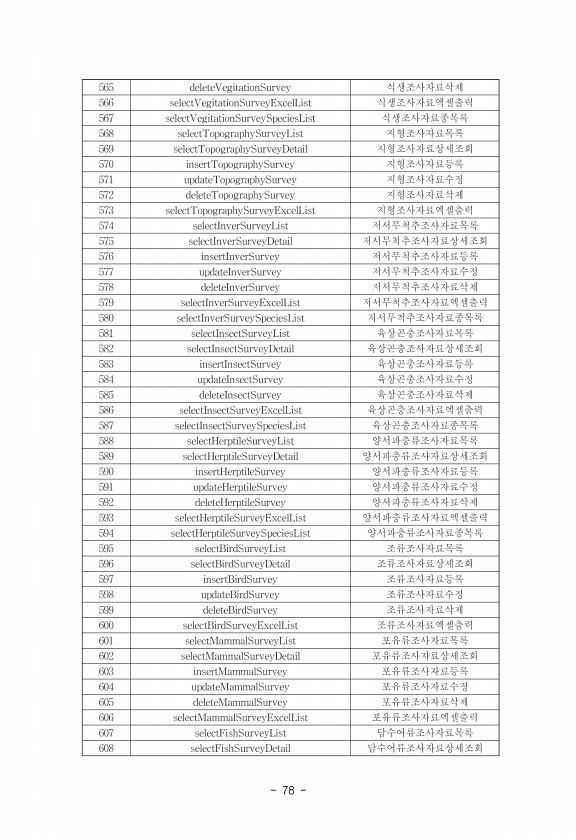 78 565 deleteVegitationSurvey 식생조사자료삭제 566 selectVegitationSurveyExcelList 식생조사자료abcd 569 selectVegitationSurveySpeciesList 식생조사자료n목록 56? selectTopographySurveyList 지형조사자료목록 56B selectTopographySurvey3etail 지형조사자료상5조0 590 insertTopographySurvey 지형조사자료8록? updateTopographySurvey 지형조사자료수? deleteTopographySurvey 지형조사자료삭제? selectTopographySurveyExcelList 지형조사자료abcd 59. selectQnverSurveyList 저서무척추조사자료목록...