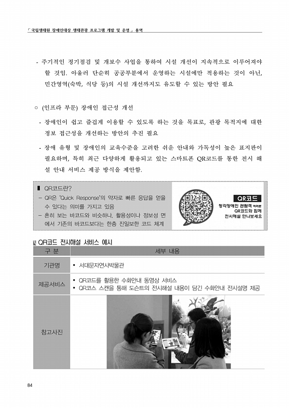 ?국립생태원 장애인대상 생태관광 프로그램 개발 및 운영? 용역 84 주기적인 정기점검 및 개보수 사업을 통하여 시설 개선이 지속적으로 이루어져야 할 것임. 아울러 단순히 공공부분에서 운영하는 시설에만 적용하는 것이 아닌, 민간영역 숙박, 식당 등 의 시설 개선까지도 유도할 수 있는 방안 필요 ? 인프라 부문 장애인 접근성 개선 장애인이 쉽고 즐겁게 이용할 수 있도록 하는 것을 목표로, 관광 목적지에 대한 정보 접근성을 개선하는 방안의 추진 필요 장애 유형 및 장애인의 교육수준을 고려한 쉬운 안내와 가독성이 높은 표지판이 필요하며, 특히 최근 다양하게 활용되고 있는 스마트폰 QR코드를 통한 전시 해 설 안내 서비스 제공 방식을 제안함. ? QR코드란? QR은 Quick Response의 약자로 빠른 응답을 얻...
