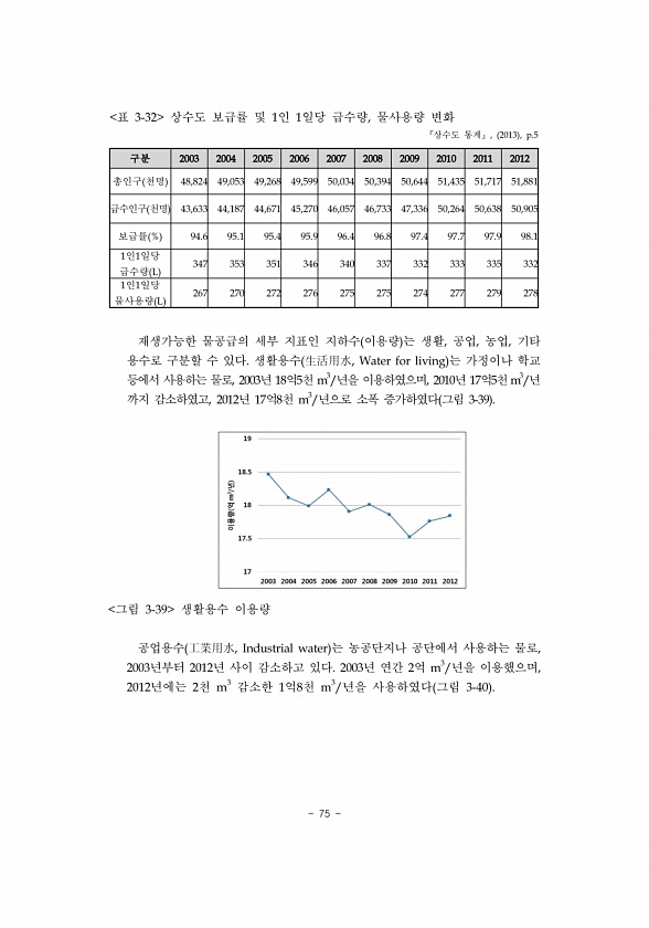 75 구분 2003 2004 2005 2006 2007 2008 2009 2010 2011 2012 총인구 천명 48,824 49,053 49,268 49,599 50,034 50,394 50,644 51,435 51,717 51,881 급수인구 천명 43,633 44,187 44,671 45,270 46,057 46,733 47,336 50,264 50,638 50,905 보급률 % 94.6 95.1 95.4 95.9 96.4 96.8 97.4 97.7 97.9 98.1 1인1일당 급수량 L 347 353 351 346 340 337 332 333 335 332 1인1일당 물사용량 L 267 270 272 276 275 275 274 277 279 278 표 3-32 상수도 보급률 및 1인 1일당 급수량,...