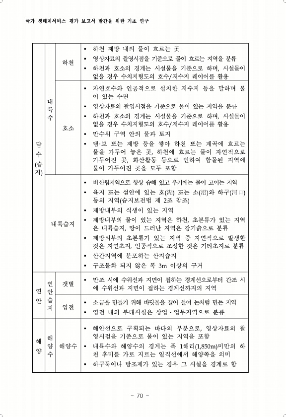 국가 생태계서비스 평가 보고서 발간을 위한 기초 연구 70 담 수 습 지 내 륙 수 하천 ? 하천 제방 내의 물이 흐르는 곳 ? 영상자료의 촬영시점을 기준으로 물이 흐르는 지역을 분류 ? 하천과 호소의 경계는 시설물을 기준으로 하며, 시설물이 없을 경우 수치지형도의 호수/저수지 레이어를 활용 호소 ? 자연호수와 인공적으로 설치한 저수지 등을 말하며 물 이 있는 수면 ? 영상자료의 촬영시점을 기준으로 물이 있는 지역을 분류 ? 하천과 호소의 경계는 시설물을 기준으로 하며, 시설물이 없을 경우 수치지형도의 호수/저수지 레이어를 활용 ? 만수위 구역 안의 물과 토지 ? 댐·보 또는 제방 등을 쌓아 하천 또는 계곡에 흐르는 물을 가두어 놓은 곳, 하천에 흐르는 물이 자연적으로 가두어진 곳, 화산활동 등으로 인하여 ...