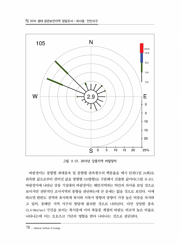 2016 생태·경관보전지역 정밀조사 하시동 · 안인사구 78 ? National Institute of Ecology 그림 Ⅱ-21. 2015년 강릉지역 바람장미 바람장미는 풍향별 최대풍속 및 풍향별 관측횟수의 백분율을 매시 단위 1일 24회 로 관측한 값으로부터 얻어진 값을 방향별 16방향 로 구분해서 산출한 값이다 그림 Ⅱ-21 바람장미에 나타난 강릉 기상대의 바람장미는 해안지역과는 약간의 차이를 보일 것으로 보이지만 전반적인 조사지역의 풍향을 판단하는데 큰 문제는 없을 것으로 보인다. 이에 따르면 한반도 전역과 유사하게 북서와 서북서 방향의 풍향이 가장 높은 비중을 차지하 고 있어, 동해안 지역 사구의 발달에 불리한 것으로 나타난다. 다만 상당한 풍속 3.48m/sec 구간을 보이는 북서풍에 이어 북동...