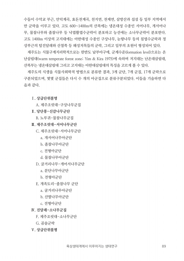 육상생태계에서 이루어지는 생태연구 89 수들이 수악교 부근, 안덕계곡, 효돈천계곡, 천지연, 천제연, 삼방산과 섭섬 등 일부 지역에서 만 군락을 이루고 있다. 고도 6001400m의 산복에는 냉온대성 수종인 서어나무, 개서어나 무, 물참나무와 졸참나무 등 낙엽활엽수군락이 분포하고 능선에는 소나무군락이 분포한다. 고도 1400m 이상의 고지대에는 아한대성 수종인 구상나무, 눈향나무 등의 침엽수군락과 정 상부근의 털진달래와 산철쭉 등 왜성저목들의 군락, 그리고 일부의 초원이 형성되어 있다. 제주도는 식물구계지리학적으로는 한반도 남부아구에, 군계수준 formation level 으로는 온 난삼림대 warm temperate forest zone; Yim & Kira 1975 에 속하며 저지대는 난온대삼림대, 산복...