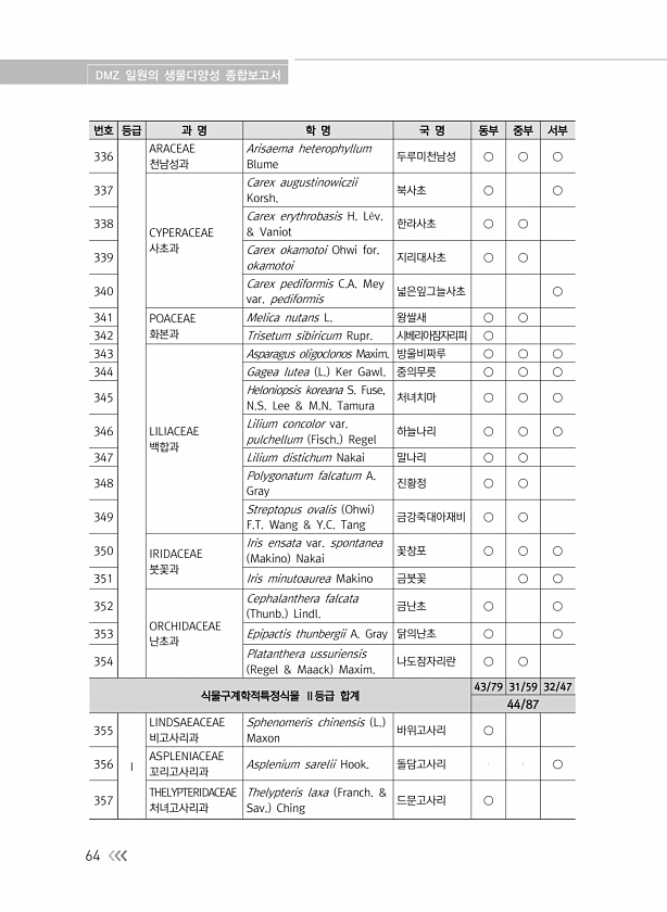 DMZ 일원의 생물다양성 종합보고서 64 번호 등급 과 명 학 명 국 명 동부 중부 서부 336 ARACEAE 천남성과 Arisaema heterophyllum Blume 두루미천남성 ○ ○ ○ 337 CYPERACEAE 사초과 Carex augustinowiczii Korsh. 북사초 ○ ○ 338 Carex erythrobasis H. L?v. & Vaniot 한라사초 ○ ○ 339 Carex okamotoi Ohwi for. okamotoi 지리대사초 ○ ○ 340 Carex pediformis C.A. Mey var. pediformis 넓은잎그늘사초 ○ 341 POACEAE 화본과 Melica nutans L. 왕쌀새 ○ ○ 342 Trisetum sibiricum Rupr. 시베리아잠자리피 ○ 3...