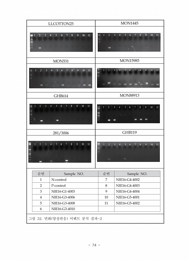 LLCOTTON25 MON1445 1 2 3 4 5 6 7 8 9 10 11 1 2 3 4 5 6 7 8 9 10 11 MON531 MON15985 1 2 3 4 5 6 7 8 9 10 11 GHB614 MON88913 281/3006 GHB119 1 2 3 4 5 6 7 8 9 10 11 순번 Sample NO. 순번 Sample NO. 1 N-control 7 NIE16-G4-4002 2 P-control 8 NIE16-G4-4003 3 NIE16-G1-4003 9 NIE16-G4-4004 4 NIE16-G3-4006 10 NIE16-G5-4001 5 NIE16-G3-4008 11 NIE16-G5-4002 6 NIE16-G3-4010