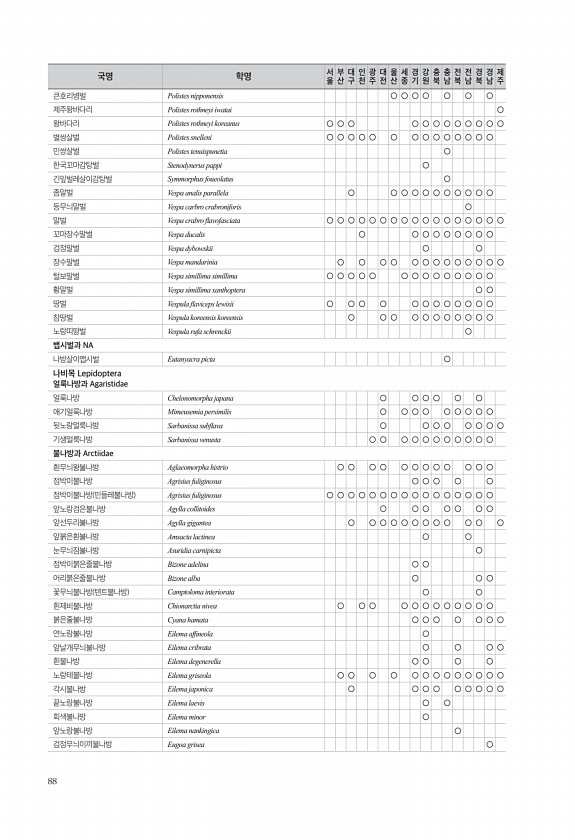 88 큰호리병벌 Polistes nipponensis ○ ○ ○ ○ ○ ○ ○ 제주왕바다리 Polistes rothneyi iwatai ○ 왕바다리 Polistes rothneyi koreanus ○ ○ ○ ○ ○ ○ ○ ○ ○ ○ ○ ○ 별쌍살벌 Polistes snelleni ○ ○ ○ ○ ○ ○ ○ ○ ○ ○ ○ ○ ○ ○ 민쌍살벌 Polistes tenuispunetia ○ 한국꼬마감탕벌 Stenodynerus pappi ○ 긴잎벌레살이감탕벌 Symmorphus foueolatus ○ 좀말벌 Vespa analis parallela ○ ○ ○ ○ ○ ○ ○ ○ ○ ○ ○ 등무늬말벌 Vespa carbro crabroniforis ○ 말벌 Vespa crabro favofasciata ○ ○ ○ ○ ○...