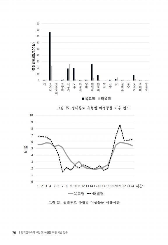 76 그림 35. 생태통로 유형별 야생동물 이용 빈도 그림 36. 생태통로 유형별 야생동물 이용시간 76 | 광역생태축의 보전 및 복원을 위한 기반연구