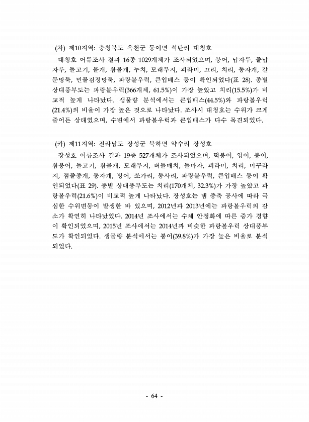 64 차 제10지역충청북도 옥천군 동이면 석탄리 대청호 대청호 어류조사 결과 16종 1029개체가 조사되었으며, 붕어, 납자루, 줄납 자루, 돌고기, 몰개, 참몰개, 누치, 모래무지, 피라미, 끄리, 치리, 동자개, 갈 문망둑, 민물검정망둑, 파랑볼우럭, 큰입배스 등이 확인되었다 표 28 종별 상대풍부도는 파랑볼우럭 366개체, 61.5% 이 가장 높았고 치리 15.5% 가 비 교적 높게 나타났다. 생물량 분석에서는 큰입배스 44.5% 와 파랑볼우럭 21.4% 의 비율이 가장 높은 것으로 나타났다. 조사시 대청호는 수위가 크게 줄어든 상태였으며, 수변에서 파랑볼우럭과 큰입배스가 다수 목견되었다. 카 제11지역전라남도 장성군 북하면 약수리 장성호 장성호 어류조사 결과 19종 527개체가 조사되었으며, 떡붕어,...