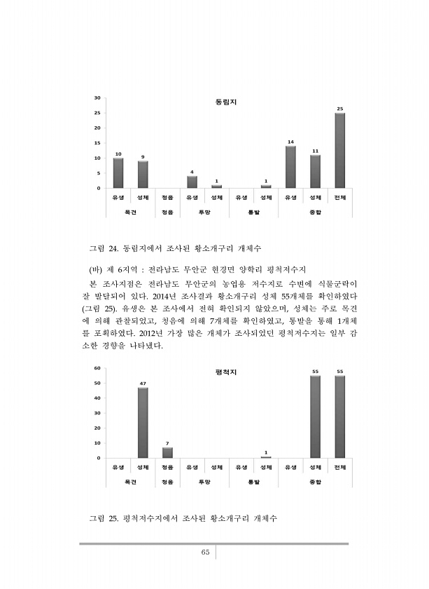 65 그림 24. 동림지에서 조사된 황소개구리 개체수 바 제 6지역 전라남도 무안군 현경면 양학리 평척저수지 본 조사지점은 전라남도 무안군의 농업용 저수지로 수변에 식물군락이 잘 발달되어 있다. 2014년 조사결과 황소개구리 성체 55개체를 확인하였다 그림 25 유생은 본 조사에서 전혀 확인되지 않았으며, 성체는 주로 목견 에 의해 관찰되었고, 청음에 의해 7개체를 확인하였고, 통발을 통해 1개체 를 포획하였다. 2012년 가장 많은 개체가 조사되었던 평척저수지는 일부 감 소한 경향을 나타냈다. 그림 25. 평척저수지에서 조사된 황소개구리개체수