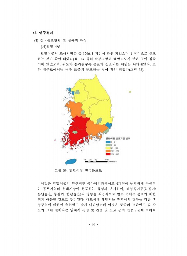 70 다. 연구결과 1 전국분포현황 및 생육지 특성 가 달맞이꽃 달맞이꽃의 조사지점은 총 1296개 지점이 확인 되었으며 전국적으로 분포 하는 것이 확인 되었다 표 14 특히 남부지방의 해발고도가 낮은 곳에 집중 되어 있었으며, 위도가 올라갈수록 분포가 감소되는 패턴을 나타내었다. 또 한 제주도에서는 매우 드물게 분포하는 것이 확인 되었다 그림 33 그림 33. 달맞이꽃 전국분포도 이것은 달맞이꽃의 원산지인 북아메리카에서도 4계절이 뚜렷하게 구분되 는 동부지역의 온대지방에 분포하는 특성과 유사하며, 해양성기후 하절기온난습윤, 동절기한랭습윤 의 영향을 직접적으로 받는 곳에는 분포가 제한 되기 때문인 것으로 추정된다. 대도시에 해당되는 광역시의 경우는 다른 행 정구역에 비하여 출현빈도 낮게 나타났는데 이것은 토...