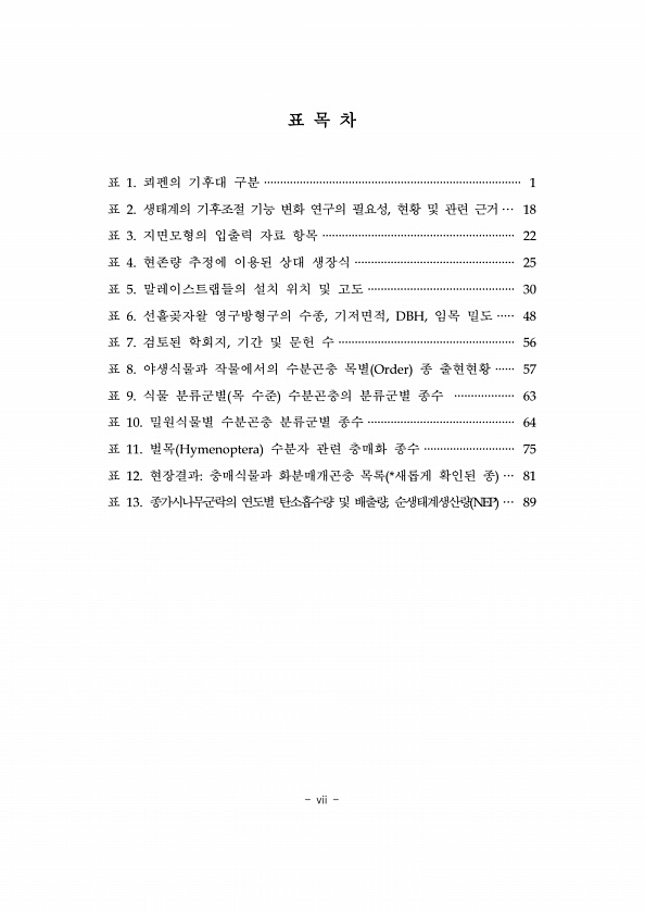 vii 표 목 차 표 1. 쾨펜의 기후대 구분 ··············································································· 1 표 2. 생태계의 기후조절 기능 변화 연구의 필요성, 현황 및 관련 근거 ··· 18 표 3. 지면모형의 입출력 자료 항목 ··························································· 22 표 4. 현존량 추정에 이용된 상대 생장식 ················································· 25 표 5. 말레이스트랩들의 설치 위치 및 고도 ············································· 30 표 6. 선흘곶자...