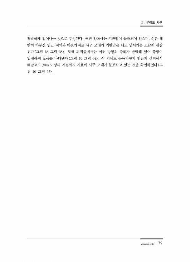 Ⅱ. 우이도 사구 www.nie.re.kr ? 79 활발하게 일어나는 것으로 추정된다. 해빈 양쪽에는 기반암이 돌출되어 있으며, 성촌 해 안의 마두산 인근 지역과 마찬가지로 사구 모래가 기반암을 타고 넘어가는 모습이 관찰 된다 그림 18 그림 63 모래 퇴적층에서는 여러 방향의 층리가 발달해 있어 풍향이 일정하지 않음을 나타낸다 그림 19 그림 64 이 외에도 돈목저수지 인근의 산지에서 해발고도 30m 이상의 지점까지 지표에 사구 모래가 분포하고 있는 것을 확인하였다 그 림 20 그림 65