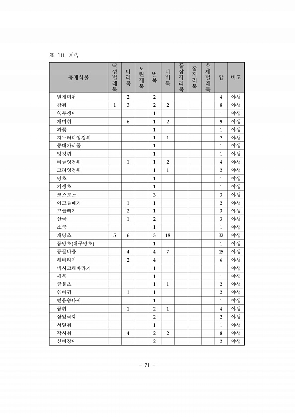 71 충매식물 딱정벌레목 파리목 노린재목 벌목 나비목 풀잠자리목 잠자리목 총채벌레목 합 비고 벌개미취 2 2 4 야생 참취 1 3 2 2 8 야생 쑥부쟁이 1 1 야생 개미취 6 1 2 9 야생 과꽃 1 1 야생 지느러미엉겅퀴 1 1 2 야생 중대가리풀 1 1 야생 엉겅퀴 1 1 야생 바늘엉겅퀴 1 1 2 4 야생 고려엉겅퀴 1 1 2 야생 망초 1 1 야생 기생초 1 1 야생 코스모스 3 3 야생 이고들빼기 1 1 2 야생 고들빼기 2 1 3 야생 산국 1 2 3 야생 소국 1 1 야생 개망초 5 6 3 18 32 야생 봄망초 대구망초 1 1 야생 등골나물 4 4 7 15 야생 해바라기 2 4 6 야생 멕시코해바라기 1 1 야생 께묵 1 1 야생 금불초 1 1 2 야생 씀바귀 1 1 2 야생 벋음씀바귀 1...