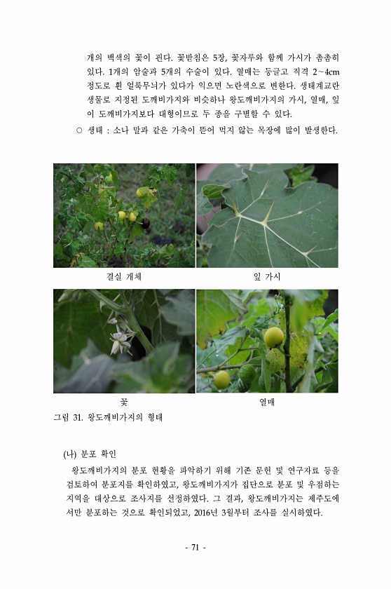 71 개의 백색의 꽃이 핀다. 꽃받침은 5장, 꽃자루와 함께 가시가 촘촘히 있다. 1개의 암술과 5개의 수술이 있다. 열매는 둥글고 직격 2∼4cm 정도로 흰 얼룩무늬가 있다가 익으면 노란색으로 변한다. 생태계교란 생물로 지정된 도깨비가지와 비슷하나 왕도깨비가지의 가시, 열매, 잎 이 도깨비가지보다 대형이므로 두 종을 구별할 수 있다. ○ 생태 소나 말과 같은 가축이 뜯어 먹지 않는 목장에 많이 발생한다. 결실 개체 잎 가시 꽃 열매 그림 31. 왕도깨비가지의 형태 나 분포 확인 왕도깨비가지의 분포 현황을 파악하기 위해 기존 문헌 및 연구자료 등을 검토하여 분포지를 확인하였고, 왕도깨비가지가 집단으로 분포 및 우점하는 지역을 대상으로 조사지를 선정하였다. 그 결과, 왕도깨비가지는 제주도에 서만 분포하는 것으...