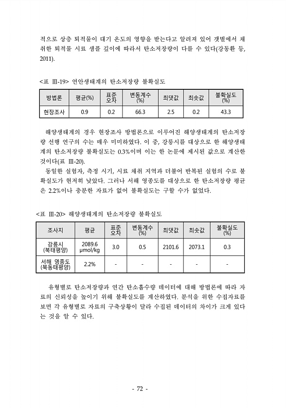 방법론 평균 % 표준 오차 변동계수 % 최댓값 최솟값 불확실도 % 현장조사 0.9 0.2 66.3 2.5 0.2 43.3 표 연안생태계의 탄소저장량 불확실도 조사지 평균 표준 오차 변동계수 % 최댓값 최솟값 불확실도 % 강릉시 북태평양 2089.6 μmol/kg 3.0 0.5 2101.6 2073.1 0.3 서해 영종도 북동태평양 2.2% 표 해양생태계의 탄소저장량 불확실도 적으로 상층 퇴적물이 대기 온도의 영향을 받는다고 알려져 있어 갯벌에서 채 취한 퇴적물 시료 샘플 깊이에 따라서 탄소저장량이 다를 수 있다 강동환 등 해양생태계의 경우 현장조사 방법론으로 이루어진 해양생태계의 탄소저장 량 선행 연구의 수는 매우 미미하였다 이 중 강릉시를 대상으로 한 해양생태 계의 탄소저장량 불확실도는 이며 이는 한 논문...