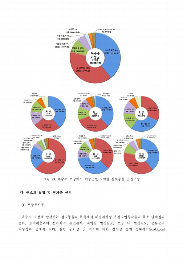 그림 23. 옥수수 포장에서 기능군별·지역별 절지동물 군집구성 다. 중요도 결정 및 평가종 선정 1 포장조사종 옥수수 포장에 발생하는 절지동물의 목록에서 해충저항성 유전자변형작물의 독소 단백질의 종류, 표적해충과의 분류학적 유연관계, 지역별 발생분포, 포장 내 발생밀도, 분류군의 다양성과 생태적 지위, 실험 용이성 및 독소에 대한 감수성 등의 생태척도ecological